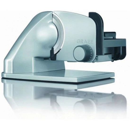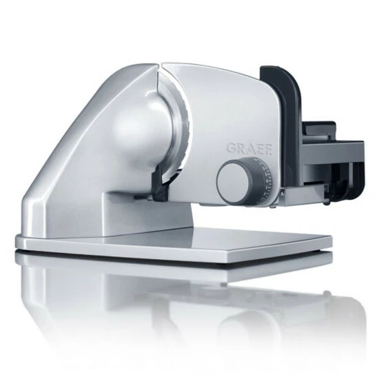 Allesschneider, Vollmetallausführung, freitragend mit großer Aluminumbodenplatte, flüsterleiser, durchzugsstarker Kondensatormotor 170 Watt, 170 mm Ø, glattes, elektrolytisch geschliffenes, durchgehärtetes Edelstahlmesser, stabile Messerhalterung durch hartverchromte Metalllagerbolzen, großer Schlitten mit Edelstahlauflage, präzise Schnittstärkeneinstellung 0-20 mm, Sicherheitsschaltautomatik, Schlittenschaltung mit Momentschalter, Kindersicherung „electric“ durch Schalterverriegelung, Kabelfach, Restehalter, Kunststofftablett, L x B x H = 365 x 290 x 250 mm