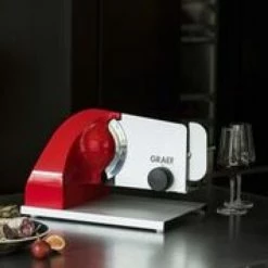 Graef Sliced Kitchen – die Küche der feinen Schnitte: Je dünner man Fleisch und Gemüse schneidet, desto mehr Aromen setzen sie frei und desto zarter umschmeicheln sie den Gaumen.- Schnell und präzise verwandelt der SKS 903 alle Zutaten in hauchdünne Scheiben aus purem Geschmack.Der Allesschneider glänzt dabei in edlem Rot durch Sicherheit, Qualität und Komfort.a.sein mit 190mm Durchmesser großes, durchgehärtetes Vollstahlmesser, das neben allen Aufgaben auch den Hauchschnitt meistert. Der Profi-Allesschneider Sliced Kitchen 903 von Graef verfügt neben seiner Vollmetallausführung und der freitragenden Bauart über einem durchzugsstarken und flüsterleisen Kondensatormotor mit einer Leistung von 185 Watt.Die Schnittstärke lässt sich dabei von 0-15mm einstellen.Der Sliced Kitchen Allesschneider 903 ist ausgestattet mit einem Ein- und Ausschalter an dem Schlittenprofil und einem Kabelfach zur bequemen Unterbringung des Kabels bei Nichtgebrauch des Gerätes.Das glatte, 190 mm große Vollstahlmesser sowie die Messerabdeckplatte lassen sich einfach und bequem abnehmen.Damit ist das Reinigen und Pflegen des Allesschneiders kinderleicht.