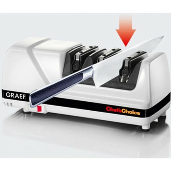 Ein-/Ausschalter; Haushalts-, Freizeit- und Gewerbemesser jederzeit nachschärfen, geeignet für Stahl- und asiatische Messer; Wellenschliff- bzw. Sägezahnmesser können in Stufe 3 nachgeschärft werden