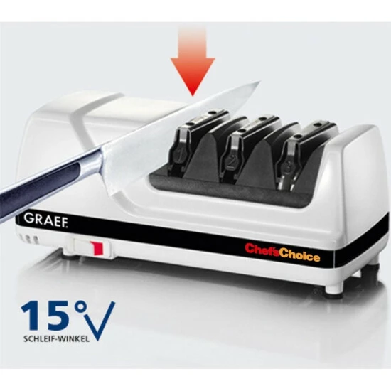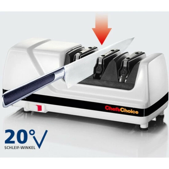Kunststoffgehäuse, 2 Phasen, Schärfen mit Diamantscheiben (15/20°), Polieren/ abziehen mit Keramikscheiben, 20° Schleifwinkel, für alle glatten und gezahnten Haushalts-, Freizeit- und Gewerbemesser geeignet (Phase 2 + 3), 15° Schleifwinkel, gut geeignet für japanische Messer (Phase 1 + 3), langsamdrehende Schleifscheiben (verhindern das Überhitzen der Klinge), genaue Messerpositionierung durch Elastomer-Winkelführung, sicher und gefahrlos für alle Messerqualitäten, minimaler Materialabtrag, Ein-/ Ausschalter