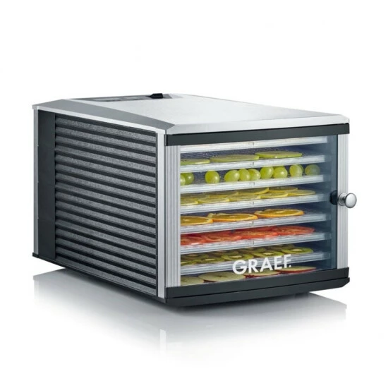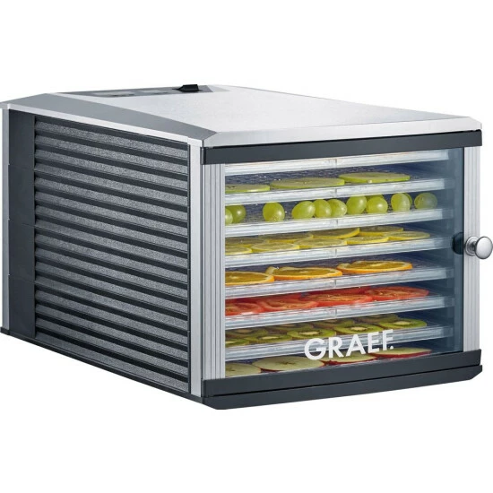 Heute erzeugt der Dörrautomat DA 508 von Graef mit modernster Technologie das zum Dörren nötige Trockenklima in jeder üche. Damit bereichert er den Trend zu SlicedKitchen, der Küche der feinen Schnitte, um eine besonders gesunde Komponente. Dank seiner Größe und seiner langen Laufzeit von bis zu 40 Stunden, dörrt das Gerät Früchte, Gemüse, Fleisch, Fisch, Nüsse und vieles mehr in fast jeder gewünschten Menge. Zudem lässt sich mit ihm eigener Joghurt herstellen. Das und mehr macht den DA 508 zum perfekten Küchenhelfer für alle, die auf eine bewusste, gesunde Ernährung setzen und möglichst keine Lebensmittel verschwenden wollen.