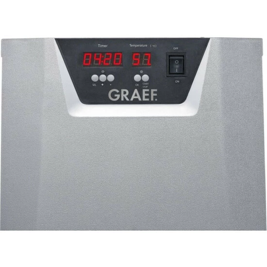 Der Clou des Geräts, ein weiteres Beispiel für die durchdachte Graef-Qualität, ist die Dry Balance Technology. Sie lässt die Temperatur im Inneren des Automaten stets um +/- 5° C schwanken. So wird allen Lebensmitteln gleichmäßig und schonend Wasser entzogen. Denn die Temperatur bleibt stets hoch genug, um sie schnell zu trocknen und tief genug, um Enzyme, Vitamine und andere wertvolle Nährstoffe zu erhalten.