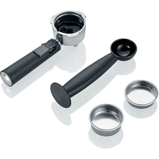 Doppelwandige Siebeinsätze für 1 und 2 Tassen, Kaffeelöffel mit integriertem Tamper und Siebträger mit 2er Auslauf.