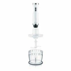 Komfort-Pürierstab mit 4 Edelstahlklingen und Anti-Spritz-Funktion Hochwertiges Kunststoffgehäuse in ergonomischem Design Inkl. spülmaschinenfestem, dreiteiligem Zubehör: 700ml BPA-freier Kunststoffbecher, Schneebesen, Zerkleinerer