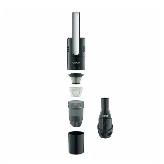 F6 x Nylon Filter). Dank eines leistungsstarken 2000mAh Li-Ionen-Akkus mit 60 Watt saugt der KC502 bis zu 15 Minuten effizient und geräuscharm. Kompakt, gründlich und schnell zur Hand- da der Platz auf einer Küchentheke stets knapp bemessen ist, wurde der Krümelchef besonders schlank und kompakt (34 cm x 8,6 cm x 7,6 cm) gebaut. Senkrecht aufgestellt, findet er überall noch eine freie Ecke. Ausgestattet mit einem zusätzlichen Bürstenaufsatz und einer Reinigungsbürste, ist der KrümelChef ein kleiner, aber saugstarker Partner für stets saubere Arbeitsflächen, insbesondere rund um den Bereich des Graef Allesschneiders oder der Kaffeemühle.