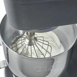 Die mitgelieferte 7-Liter-Edelstahlrührschüssel mit Füllmengenmarkierung bietet ausreichend Fassungsvermögen für große Mengen leckeren Teig. So können beispielsweise bis zu 3kg fester Hefeteig, 20 Eiweiß oder 1,2kg Sahne verarbeitet werden. Neben dem Spritzschutz sind mit dem Ballon-Schneebesen, dem Knethaken und dem Flachrührer hochwertige Rühr- bzw. Knetelemente im Lieferumfang der Küchenmaschine MYestro von GRAEF enthalten. Bei der GRAEF Küchenmaschine kommen nur die besten und langlebigsten Materialien zum Einsatz.nengeeignet. Optional kann ein Flexi-Rührer (Art.Nr. 146836) als Zubehör bestellt werden.
