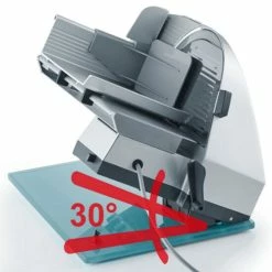 30° kippbar Durch die Kippfunktion des Allesschneiders von 30° kann das Schneidgut perfekt mit dem mitgelieferten Edelstahltablett aufgefangen werden.