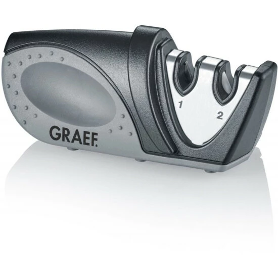 Der manuell Messerschärfer besteht aus einem hochwertigem Kunststoff- gehäuse und einem gummiertem Handgriff. Die starke, ultrascharfe und langhaltbare 2 Phasen Schneide hat einen Schleif-Winkel von 20° und ist ballig geschliffen und besonders gut geeignet für glatte und gezahnte Haushalts-, Freizeit- und Gewerbemesser.