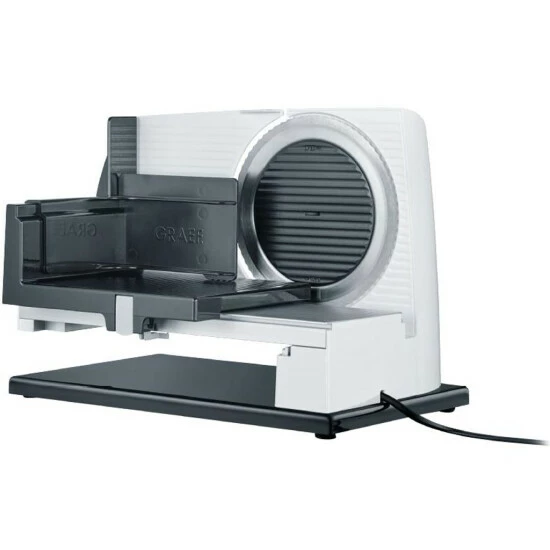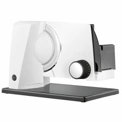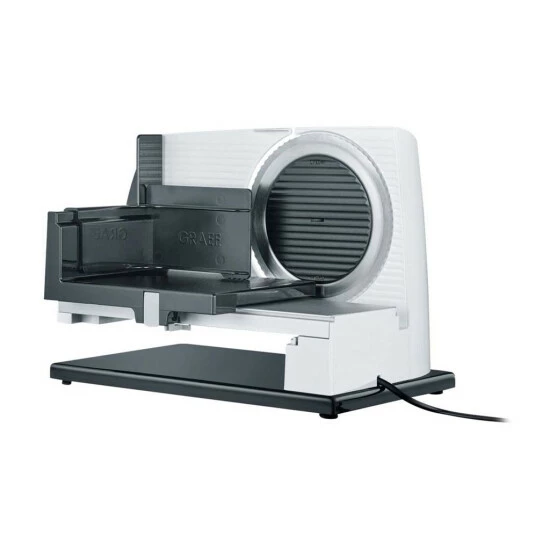 Sliced Kitchen: Hauchdünne Scheiben frisch geschnitten vom länger haltbarem Stück, für mehr Aromen und perfekte Garzeiten, Edle Einstiegs-Allesschneider in modernem Design, Einfachste Bedienung, Sichere Handhabung, Durch kompakte Abmessungen für jede Küche geeignet, 45-170 Watt Eco Power Motion Motor für höchste Laufruhe bei konstanter Drehzahl, Edelstahl-Wellenschliffmesser Ø170mm mit Safety-Verschluss für schnellen und sicheren Messerwechsel: Ideal für Brot, Wurst oder Käse, Messerabdeckplatte für optimale Schneidergebnisse, Stabiler und leichtgängiger Schlitten mit Kindersicherung, variable Schnittstärkeneinstellung 0 – 20 mm, weiße Metallmaschine, freitragend mit Kunststoffbodenplatte