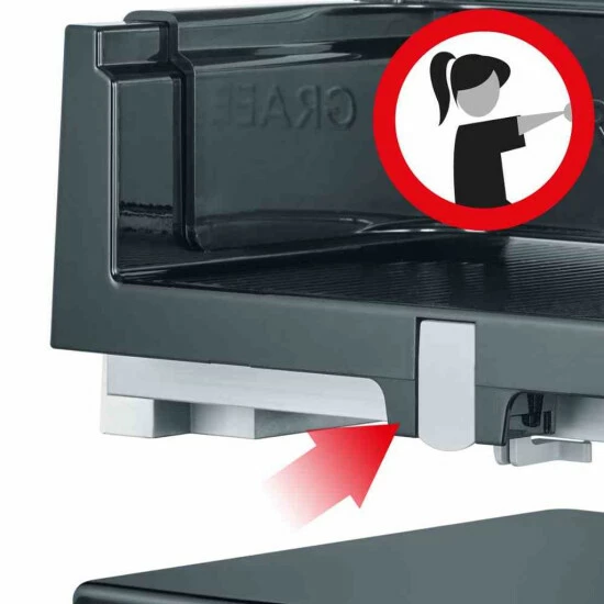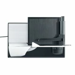 - Ein spezieller Safety-Verschluss ermöglicht es, das Messer zur Reinigung schnell und gefahrlos abzunehmen. Zudem lässt sich der Schlitten durch die Kindersicherung vor dem Messer verriegeln