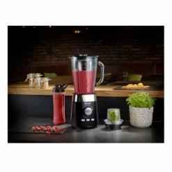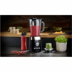 Bestehend aus einem 1,75l Glasbehälter mit Maßskala, einem kleinen extra Behälter zum zerkleinern von Lebensmitteln und praktischer ToGo Trinkflasche, stehen Ihnen verschiedene Varianten wie mixen, rühren, pürieren, shaken oder zerkleinern zur Verfügung.