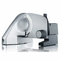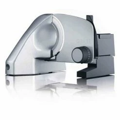 Vollmetallausführung mit Standfüßen, Schnittstärkeneinstellung 0-20 mm, gezahntes Edelstahlmesser (170 mm Durchmesser), großer Schlitten, Energiesparmotor, Ein-/Ausschalter, Kindersicherung-Schlittenfeststellung, Messerabdeckplatte aus Kunststoff, Kabelfach, Restehalter, Kunststofftablett