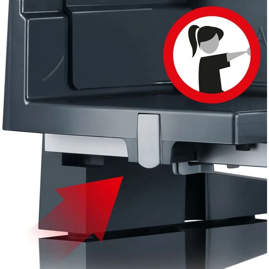 Vollmetall Mit großem Standfuß Großer Schlitten mit Kunststoffauflage Kindersicherung Kabelfach Restehalter Kunststofftablett Automatische Abschaltung nach 10 Minuten Überlastungsschutz Intelligentes Motormanagement Farbe: Silber