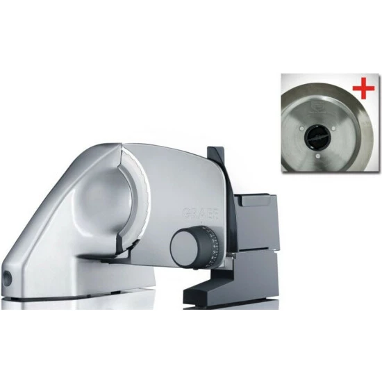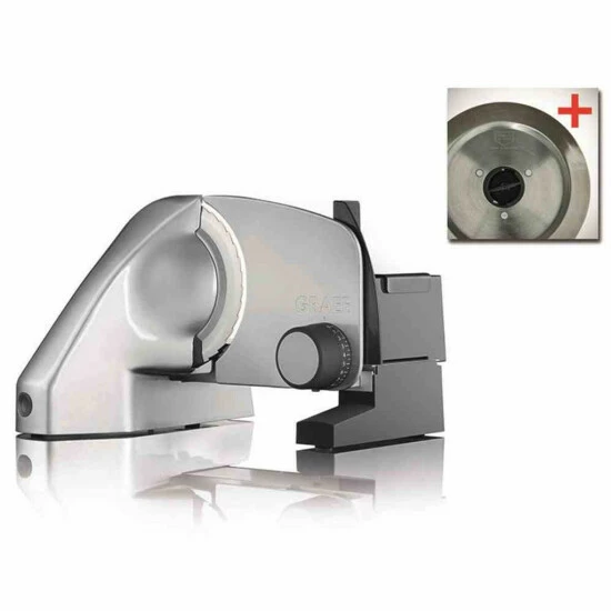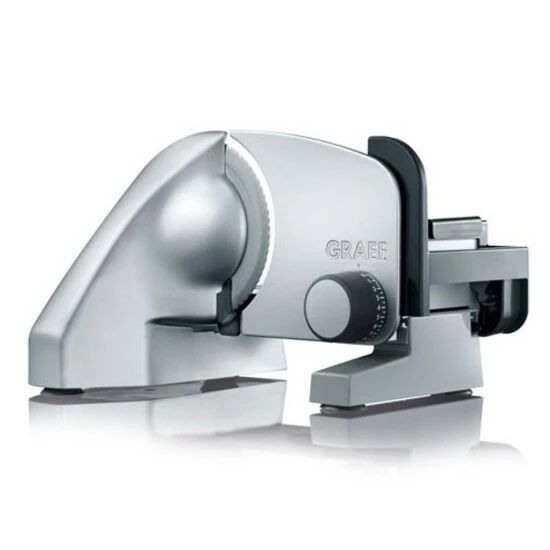 GRAEF Vivo V12 TWIN Elektro-Allesschneider Vollmetallausführung mit großen Standfüßen Energiesparmotor 88 Watt mit Spitzenschneidleistung bis zu 170 Watt, wartungsfrei Ø 170 mm gezahntes Messer aus Edelstahl Ø 170 mm glattes Messer aus Edelstahl Messerabdeckplatte aus Kunststoff Kindersicherung durch Schlittenfeststellung Ein-/Ausschalter Automatische Abschaltung nach ca. 10 Minuten Überlastungsschutz Kunststoffschlitten Schnittstärkeneinstellung 0 – 20 mm Schnitthöhe 140 mm Schnittlänge 220 mm Restehalter Kabelfach Kunststofftablett