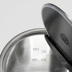 Er schaltet sich mit der Lift-Off Funktion automatisch ab, sobald man ihn während dem Kochvorgang abhebt. Der herausnehmbare Kalkfilter erleichtert das Reinigen. Der Deckel öffnet sich einfach auf Knopfdruck. Der Ein-Ausschalter ist mit einer blauen Kontrolllampe ausgestattet.
