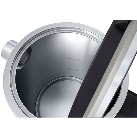 Trockengeh- und Überhitzungsschutz, Deckel öffnet auf Tastendruck, doppelwandiger Edelstahlwasserkocher (innerer Behälter und Kalkfilter aus Edelstahl, Außengehäuse aus Kunststoff), Ein-/Ausschalter mit Kontrolllampe, Lift-Off Abschaltung, autom. Abschaltung, max. Füllmenge: 1 l=8 Tassen (1 Tasse=125 ml), inkl. Basisstation mit Kabelaufwicklung, Gerätemaße (LxBxH): 205x130x230 mm