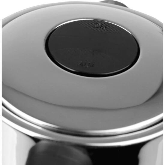 Wasserkocher, Edelstahl-Ausführung, doppelwandig, schnurlos, 1 l Fassungsvermögen, 2.015 Watt, 360 Grad Anschluß-Sockel, verdecktes Heizelement, Deckelöffnung per Knopfdruck, Innen liegende Füllmengenmarkierung, Ein-/Ausschalter, Kontroll-Leuchte, Kalkfilter, herausnehmbar, Edelstahl