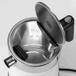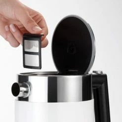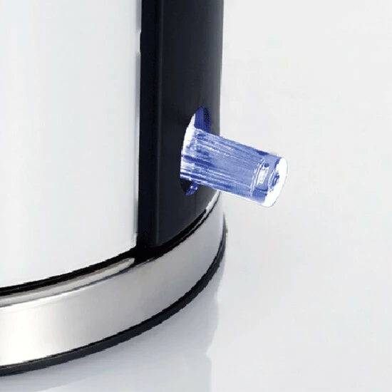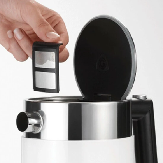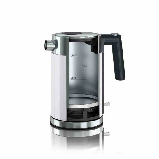 Doppelwandig, innerer Behälter aus Edelstahl, äußerer Behälter aus Acryl 360° Zentralkontakt Innenliegende Füllmengenmarkierung Deckel öffnet auf Knopfdruck Herausnehmbarer Kalkfilter Ein-/ Ausschalter mit Kontrolllampe Lift-Off Abschaltung, beim Abheben des Wasserkochers während des Kochvorgangs schaltet das Gerät ab Basisstation mit Kabelaufwicklung Weiß