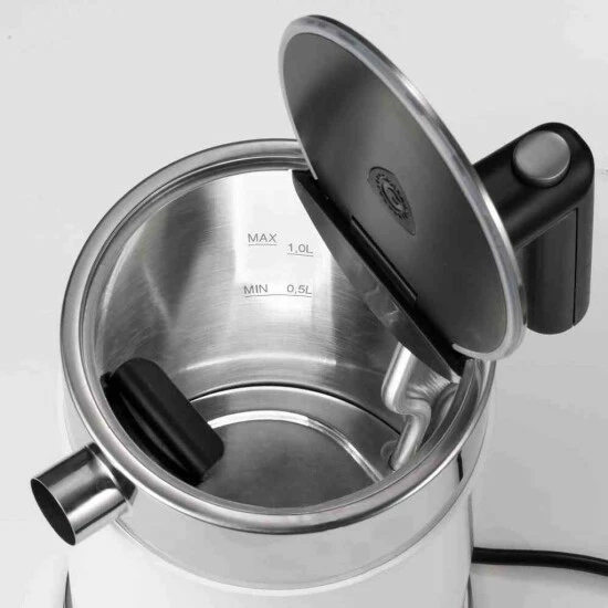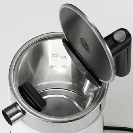 Der Wasserkocher WK 61 ist mit seinem klaren und zeitlosen Design ein Blickfang in jeder modernen KÃ1/4che. Sein hochwertiges, acrylweißes Gehäuse hält dank moderner Isolierung das Wasser noch lange warm. Zudem erleichtert die durchdachte Technik des Wasserkochers die Bedienung im Alltag bedeutend. Das zylindrische Rohr macht das Aufgießen zu einem Kinderspiel. Dabei geht auch kein heißes Wasser daneben. FÃ1/4r Sicherheit ist rundum gesorgt. Das zeigt sich auch im Trockengeh- undœberhitzungsschutz. Wird der Wasserkocher versehentlich mit zu wenig oder ohne Wasser angeschaltet, wird der Kochprozess gar nicht erst gestartet und vermeidet jegliche Verbrennungen. Er schaltet sich mit der Lift-Off Funktion automatisch ab, sobald man ihn während dem Kochvorgang abhebt. Der herausnehmbare Kalkfilter erleichtert das Reinigen. Der Deckel¶ffnet sich einfach auf Knopfdruck. Der Ein-Ausschalter ist mit einer blauen Kontrolllampe ausgestattet. Das Genießen Ihres Lieblingstees oder HeißgetrÃ