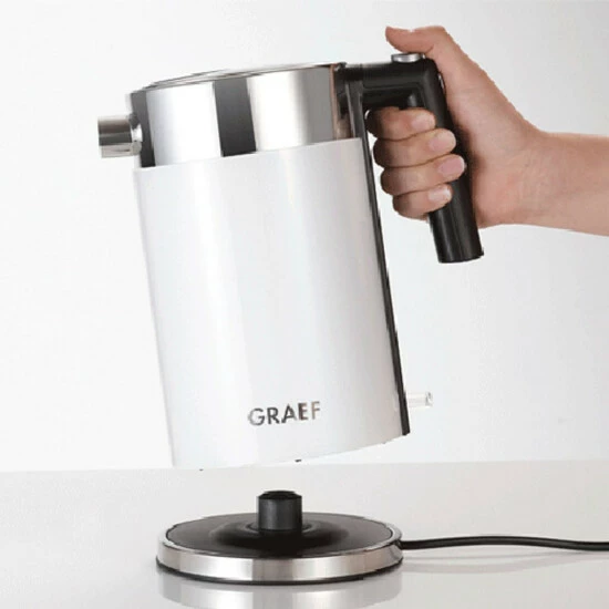 Mit einem Wasserkocher von Graef kann einfach und schnell Wasser für die Zubereitung von diversen Heißgetränken zum Kochen gebracht werden. Durch den Trockengeh- und Überhitzungsschutz ist sichergestellt, dass der Wasserkocher gar nicht erst startet, sollte zu wenig oder gar kein Wasser im Wasserkocher sein. Durch den auf Knopfdruck zu öffnenden Deckel kann der Innenraum leicht und ohne Verschütten befüllt werden. Überdies muss dank der Öffnungsautomatik nicht befürchtet werden, dass sich der Deckel während des Ausgießens selbsttätig öffnet. Der Innenbehälter aus Edelstahl ist unempfindlich gegenüber Korrosion und besitzt somit eine lange Lebensdauer.
