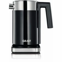 Graef Wasserkocher WK502EU sw Hersteller: Graef Bezeichnung: Wasserkocher Typ: WK502EU sw Heizschlange: verdeckt Inhalt: 1 l Werkstoff des Behälters: Edelstahl Kabellos: ja Kochstoppfunktion: ja Wasserstandanzeige: innen 360° Sockel: ja Grundfarbe: schwarz Mit Wasserfilter: nein Mit Sieb: ja Mit Temperaturregler: ja Mit Temperaturanzeige: jaGraef Wasserkocher WK502EU sw: weitere DetailsBedienung über Touch-Display mit Restwärmeanzeige, Temperaturen (40 °C, 60 °C, 70 °C, 80 °C, Kochen), Vapo-Programm zur Desinfektion von Babyfläschchen, Programm zum Erwärmen von Babynahrung, Handbrüh-Taste, 30 Min. Warmhaltefunktion, Fläschchenkorb im Lieferumfang enthalten, Basisstation mit Kabelaufwicklung Geliefert wird: Graef Wasserkocher WK502EU sw, Verpackungseinheit: 1 Stück, EAN: 4001627010614